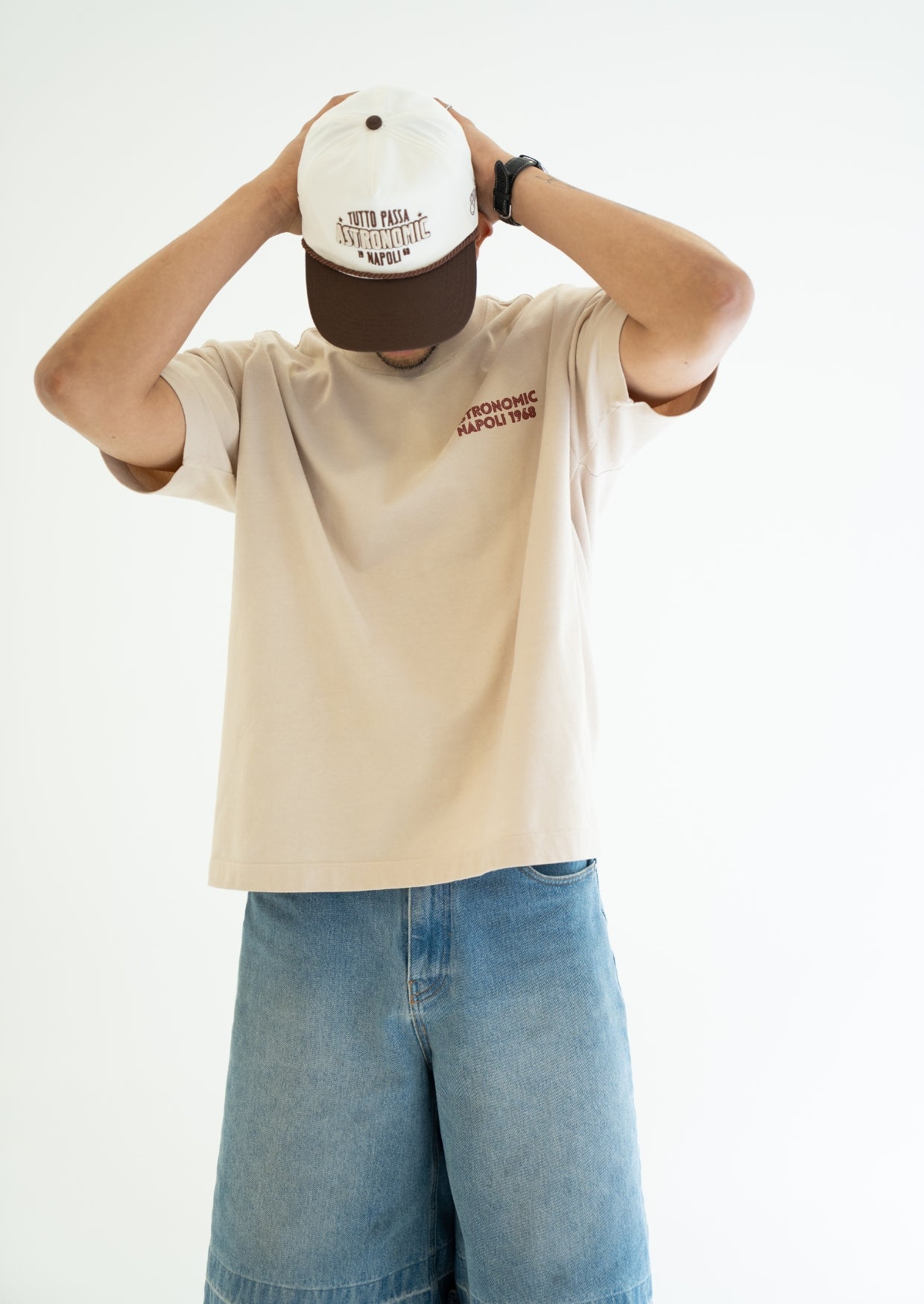 Camiseta color beige, con un nuevo molde oversize, hecha en 100% algodón premium de 250 gsm. La camiseta tiene cuello redondo en rib, estampado de la marca en el frente y un estampado en serigrafía sin tacto en la parte de la espalda
