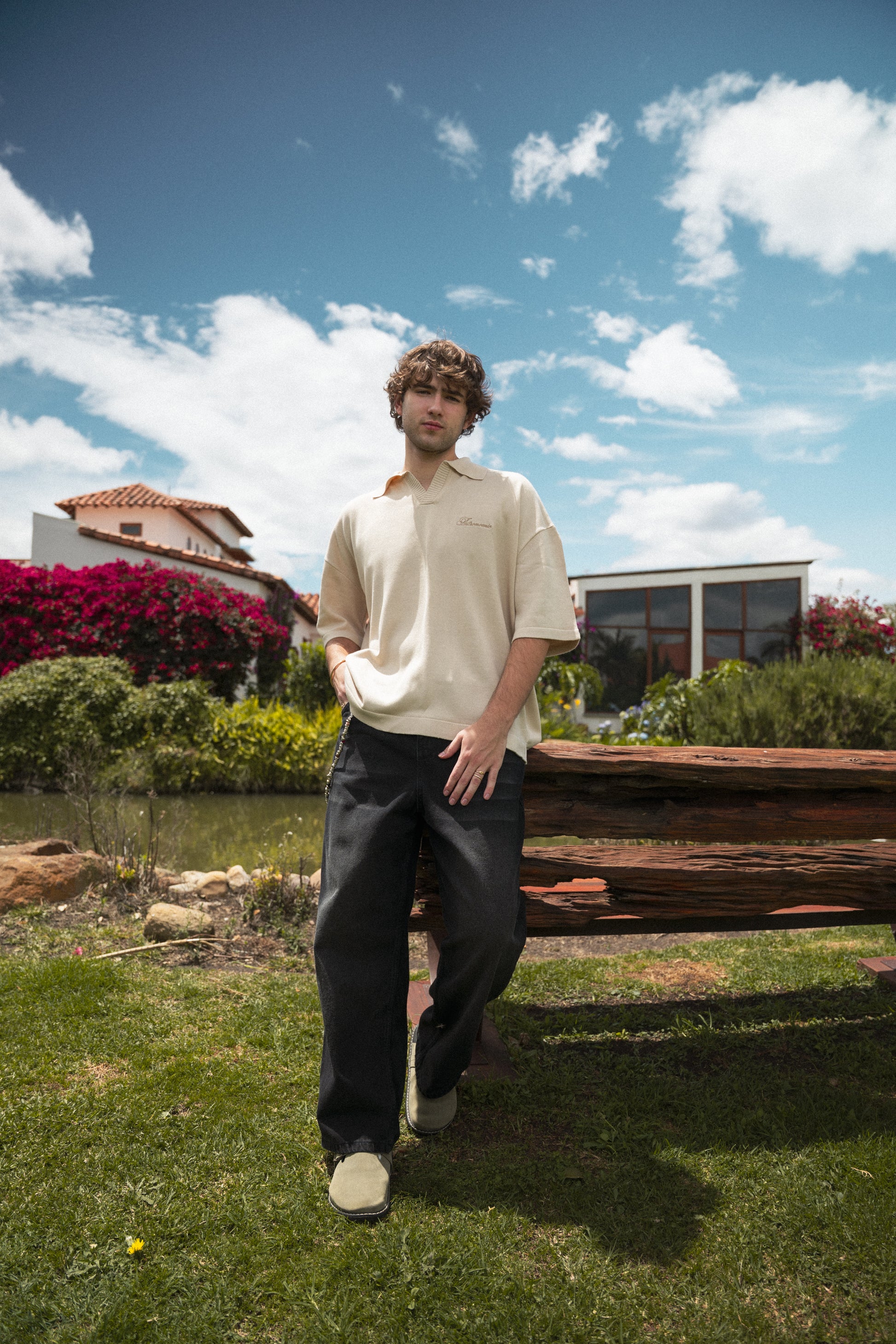 Camiseta polo color beige, con un nuevo molde oversize, hecha en tejido de punto de 400 gsm. La camiseta tiene cuello tipo polo y un bordado punto corazón del nombre de la marca.