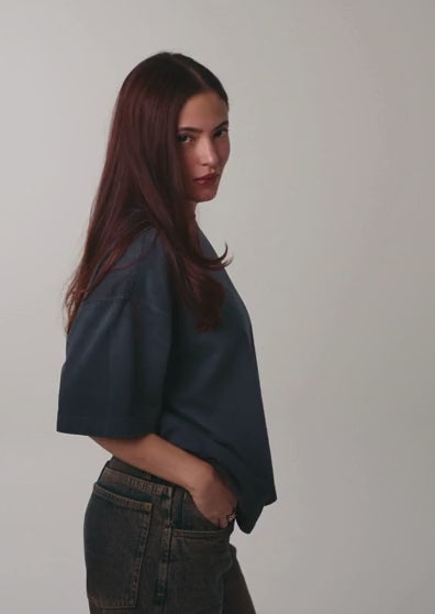 Camiseta color gris degradé, con un nuevo molde oversize, hecha en 100% algodón premium de 250 gsm. La camiseta tiene cuello redondo en rib, estampado de la marca en el frente punto corazón y en la espalda en serigrafía sin tacto.