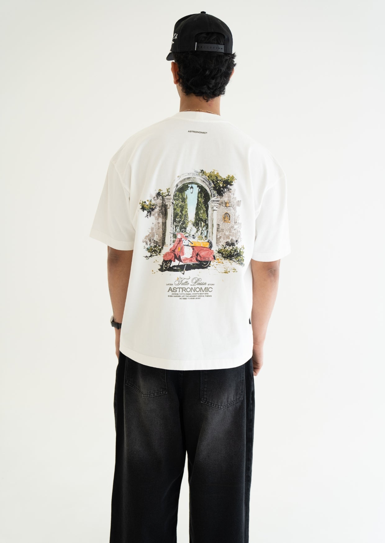 Camiseta color blanca, con un nuevo molde oversize, hecha en 100% algodón premium de 250 gsm. La camiseta tiene cuello redondo en rib, estampado de la marca en el frente en semi alta densidad y un estampado icónico de una Vespa en la Toscana, hecho en serigrafía sin tacto.