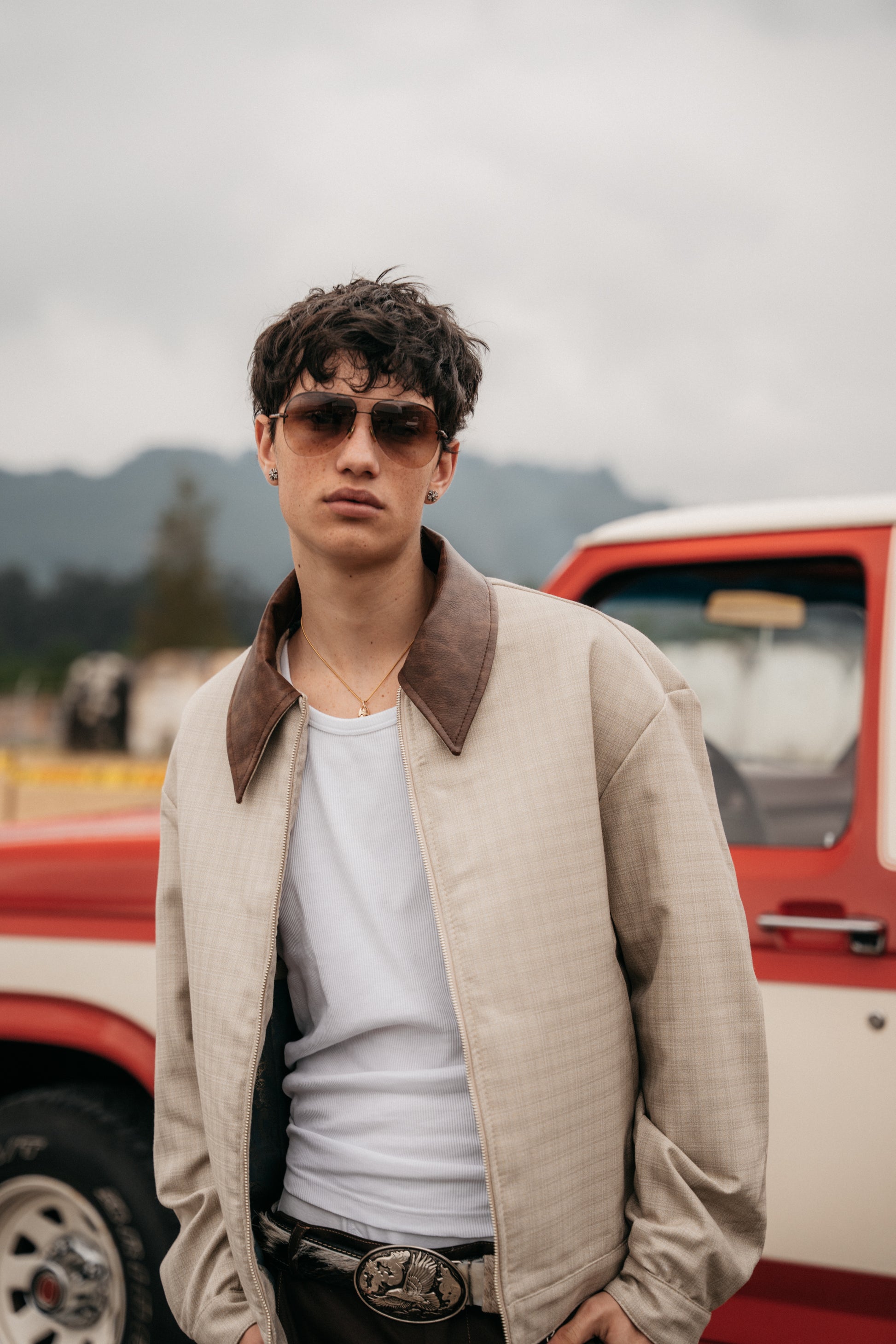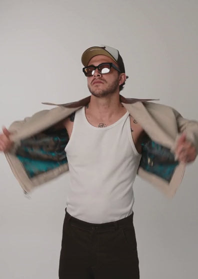 Chaqueta en paño color beige con cuadros, y cuello en cuerina. True to size, hecha en paño italiano de 100% algodón. Forro interno color verde con arabescos. Diseño bordado en la espalda. Esta chaqueta es edición limitada y solo hay 25 unidades.