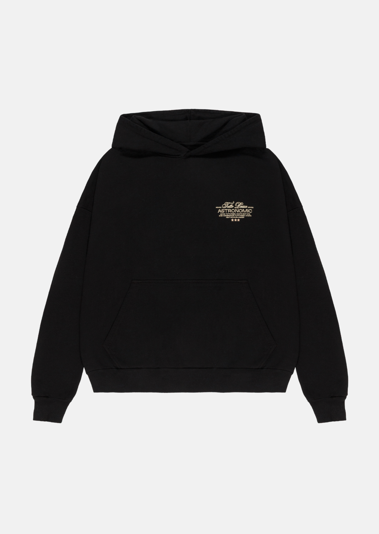 Hoodie color negro, molde Oversize, hecho en 100% algodón premium de 400 gsm. Puños y cintura en Rib, el diseño de un atardecer en Portofino está hecho serigrafía sin tacto.